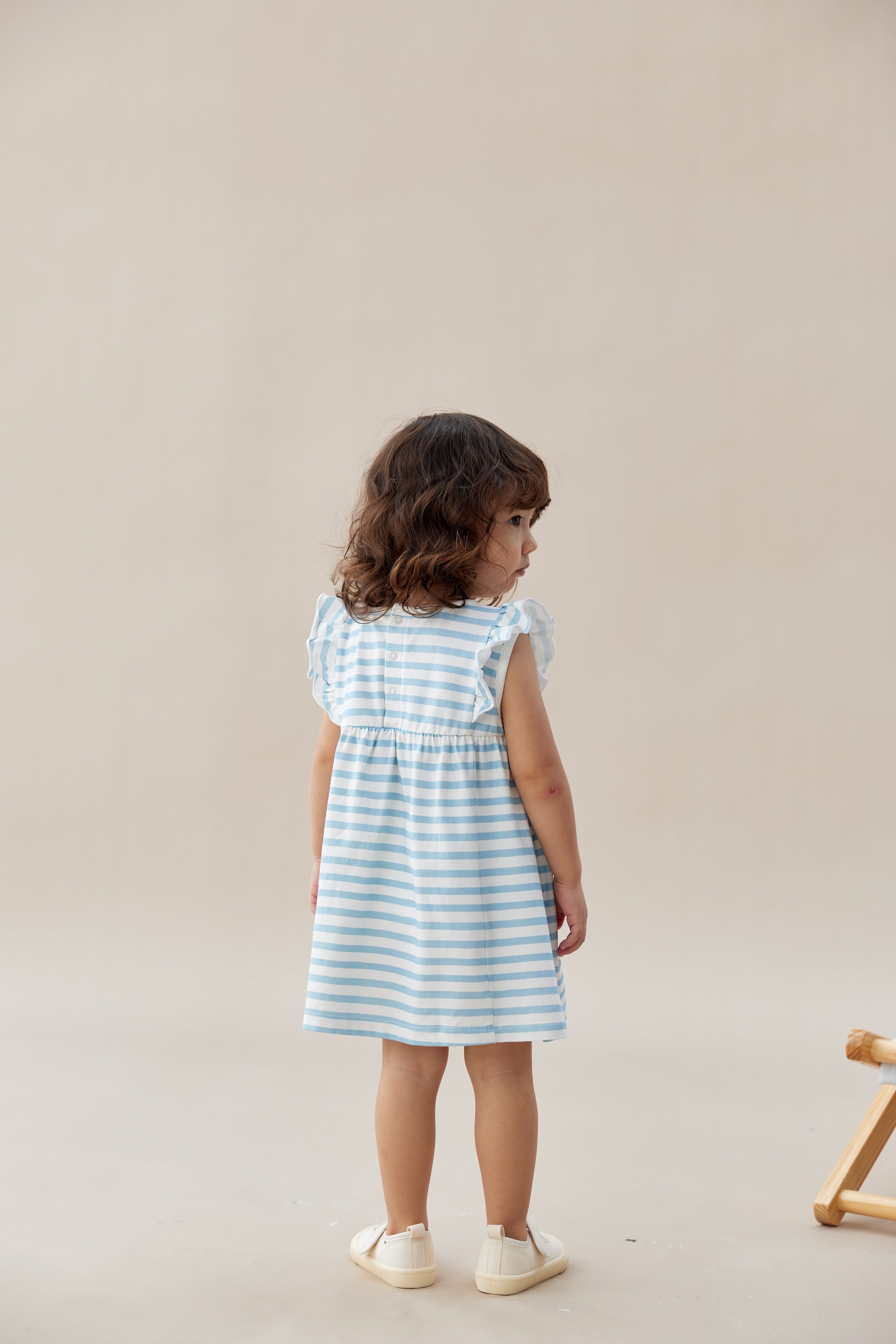 Young girl wearing a blue and white striped dress standing next to a deck chair on a beige background