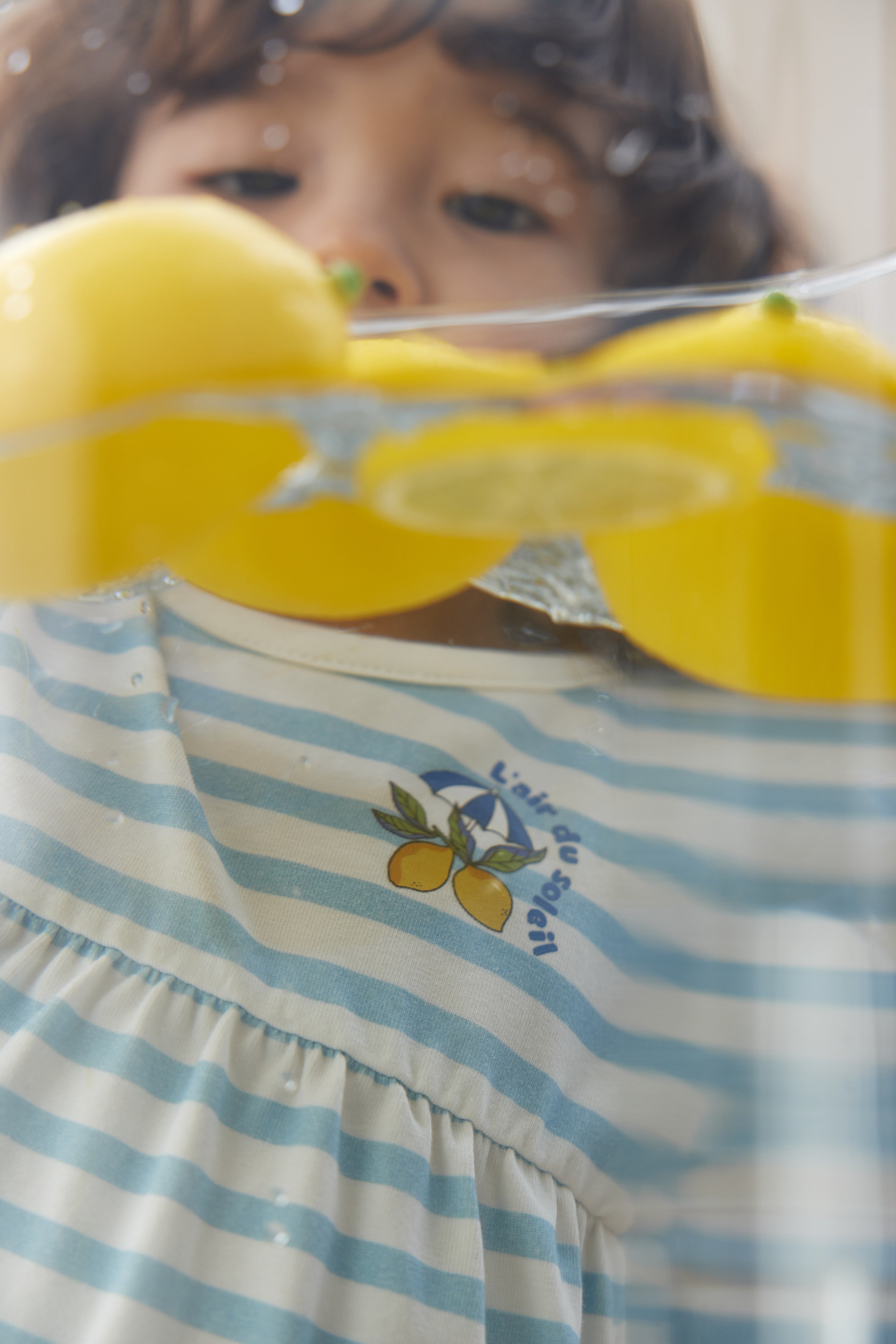 Young girl in a blue and white striped dress standing next to a glass table with lemons on a plain background