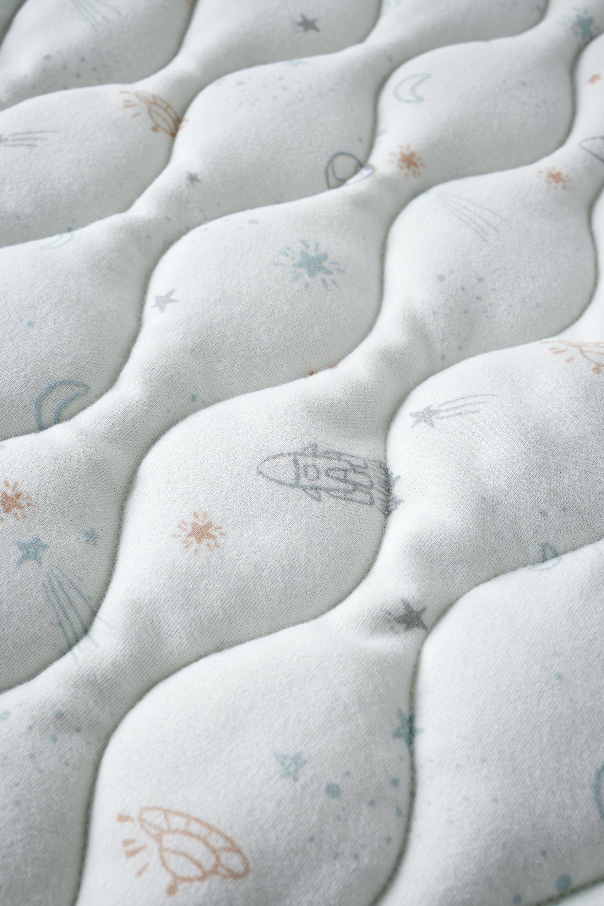 Textured fabric surface with embroidered designs of stars, planets, and rockets.