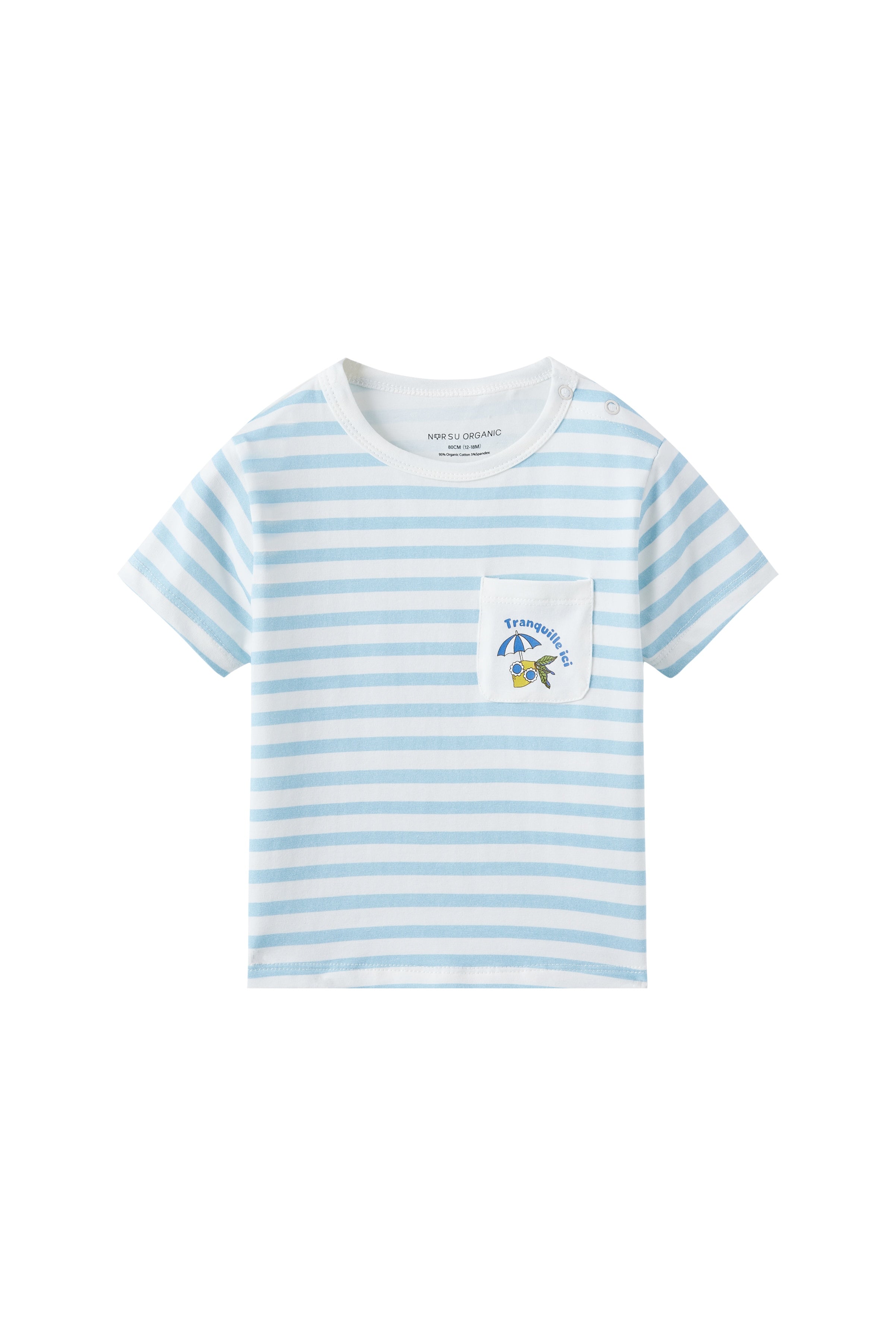 Blue and white striped t-shirt with a small pocket on a white background