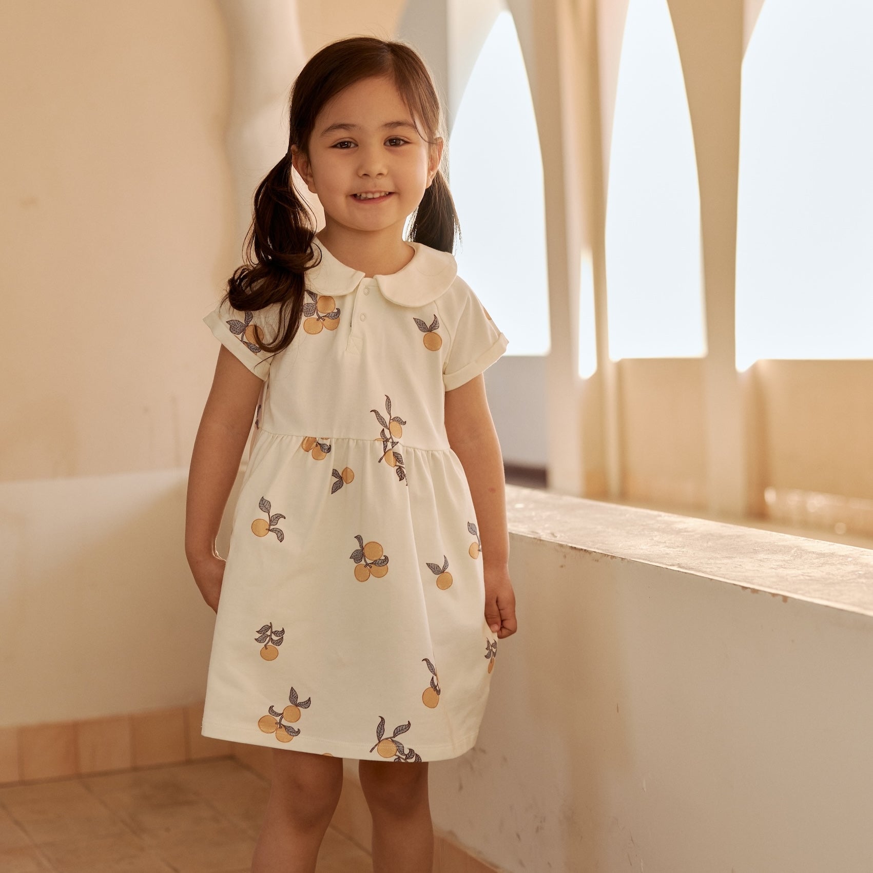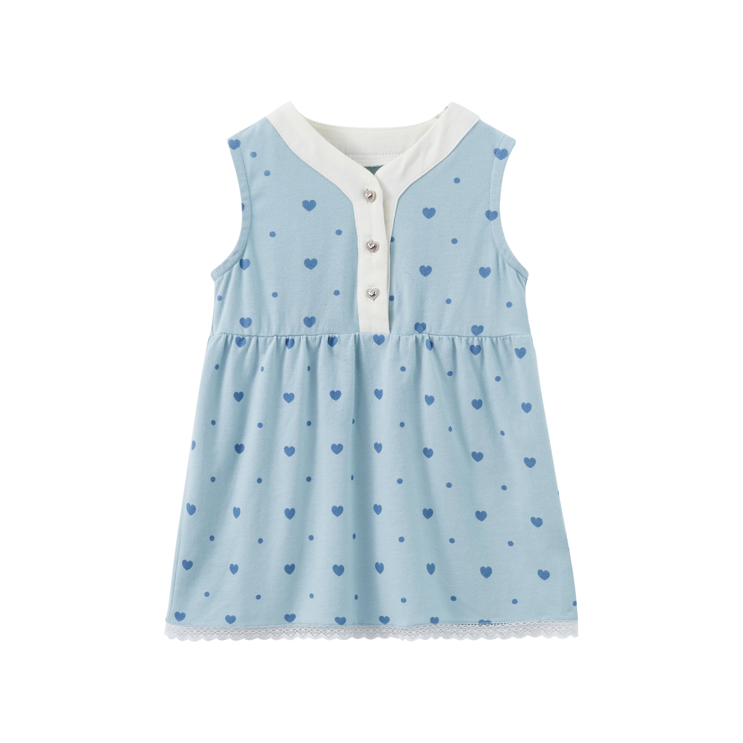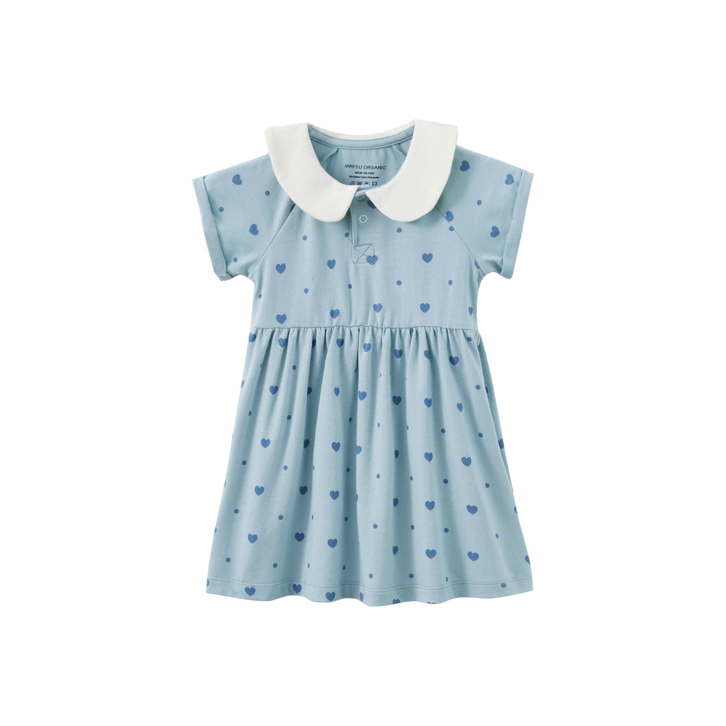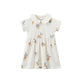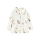 Close-up of a baby outfit with red collar and nature-themed design on a white background