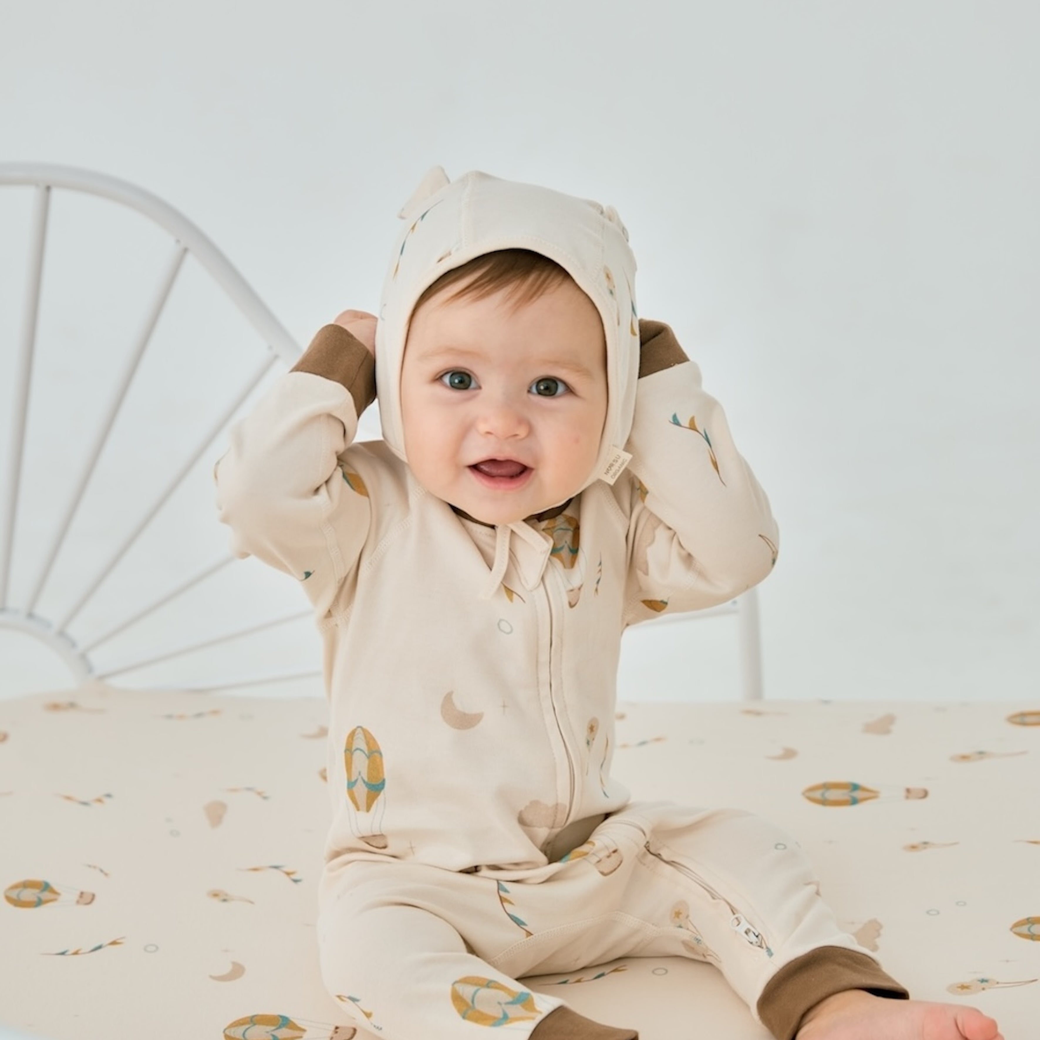 a baby lying on the bed and wear space bonnet hat and organic space kimono sleeper