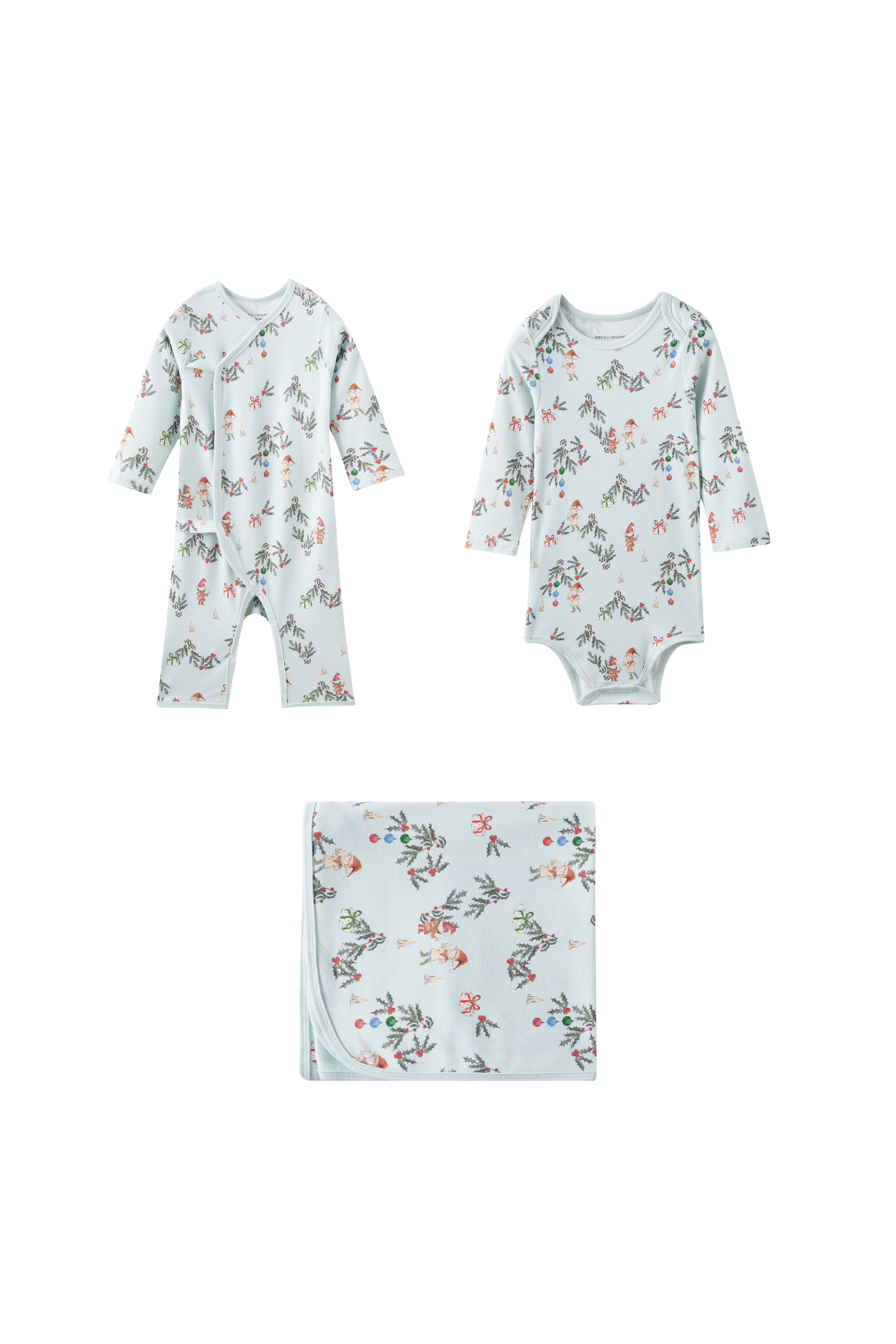 Baby pajama with Christmas-themed print on a light blue background