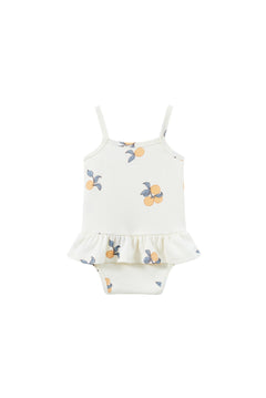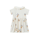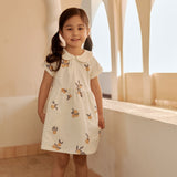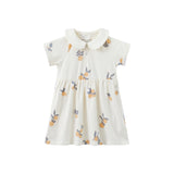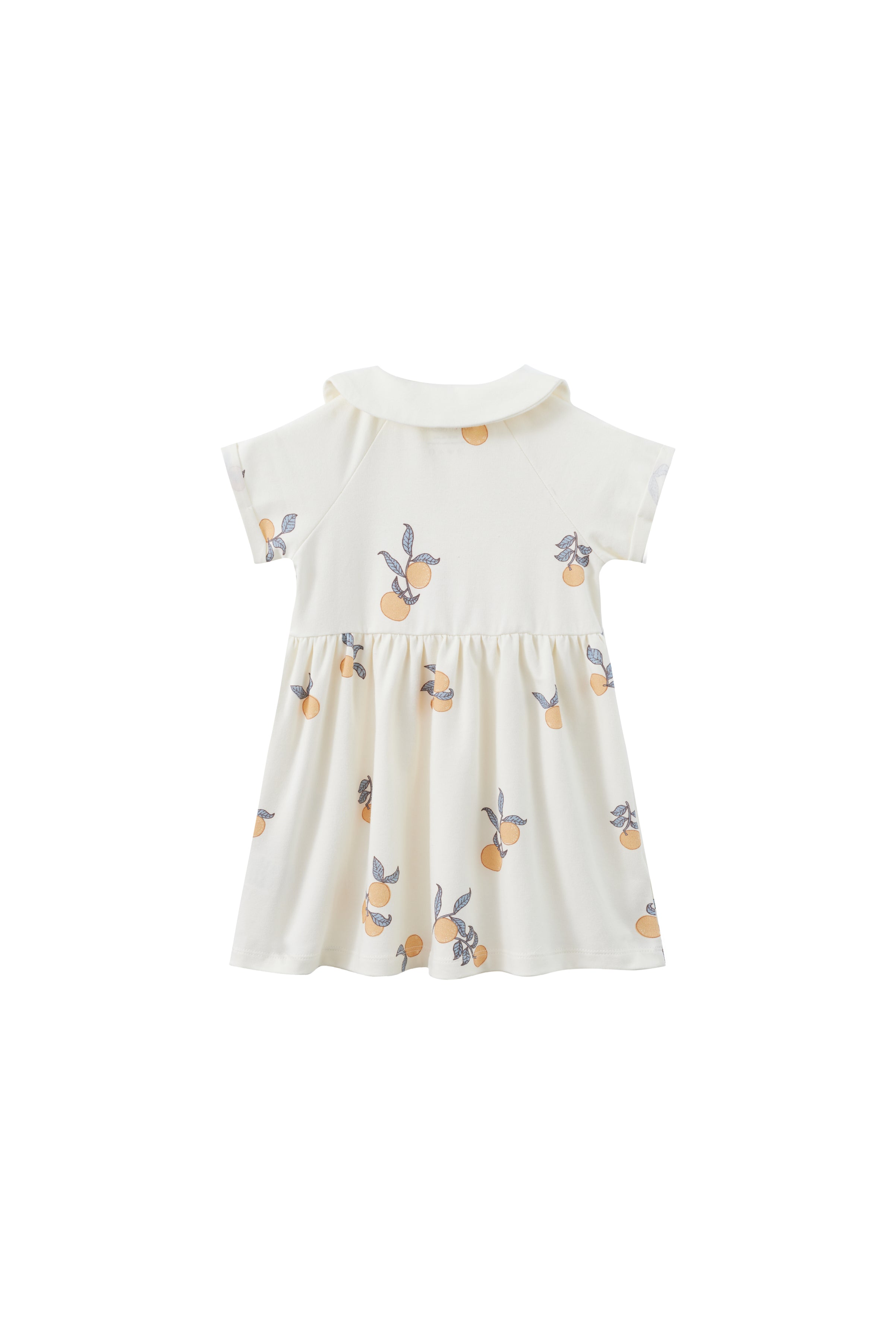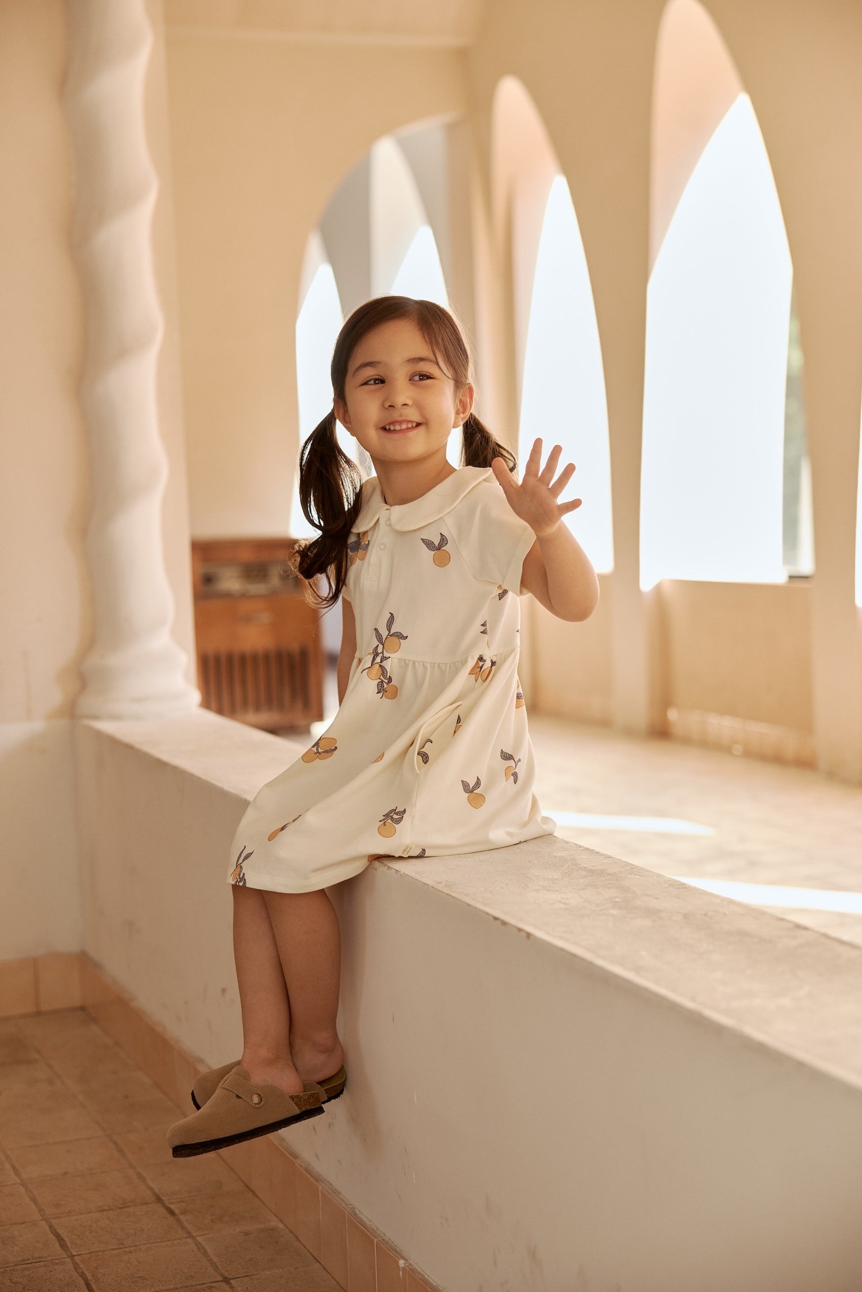 baby girl sit on the sidewall wearing Organic Cotton Collar Dress-Clementine and waving her hand