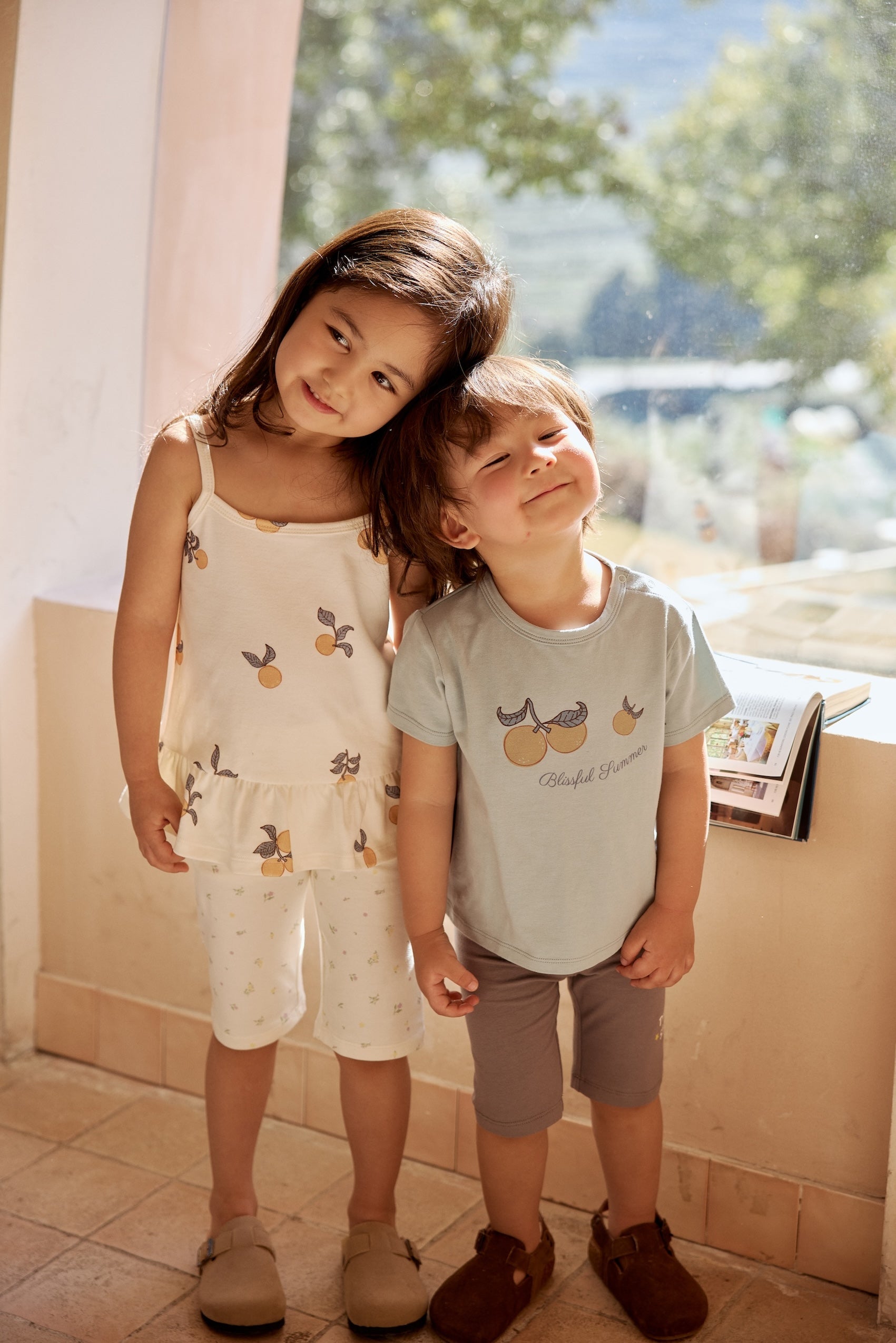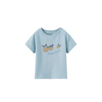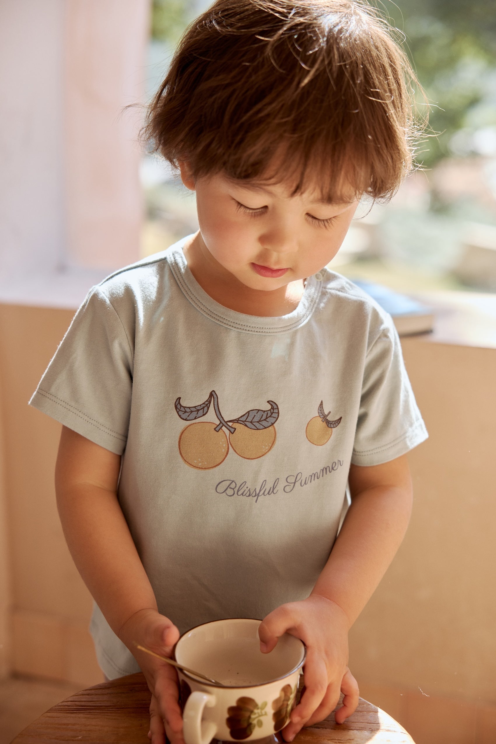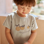 a young boy sit beside table with a cup in his hand and wearing Toddler Organic Graphic T-shirt-Clementine