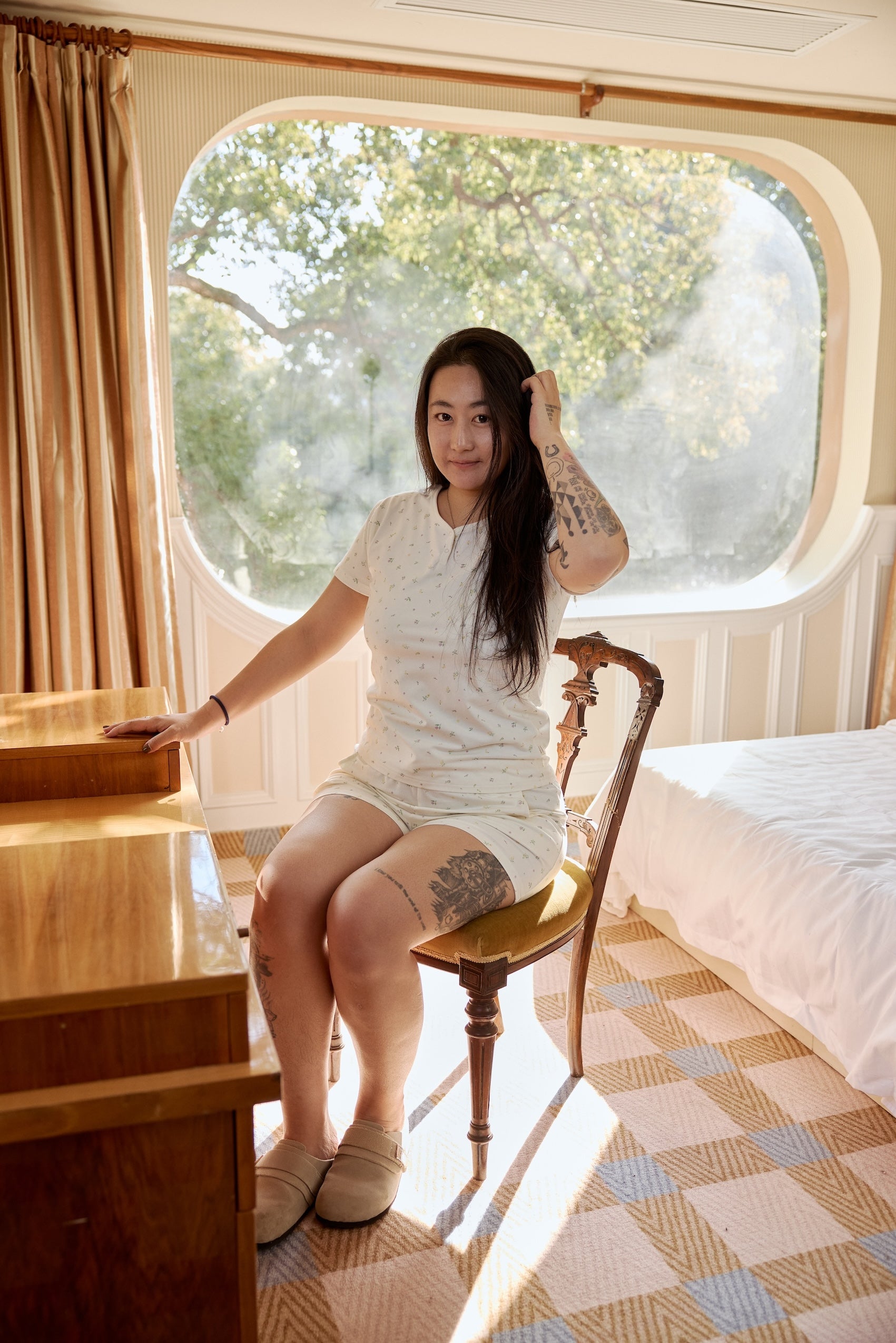 A woman relaxes in a floral bamboo lounge set, sitting comfortably on a chair in a cozy room